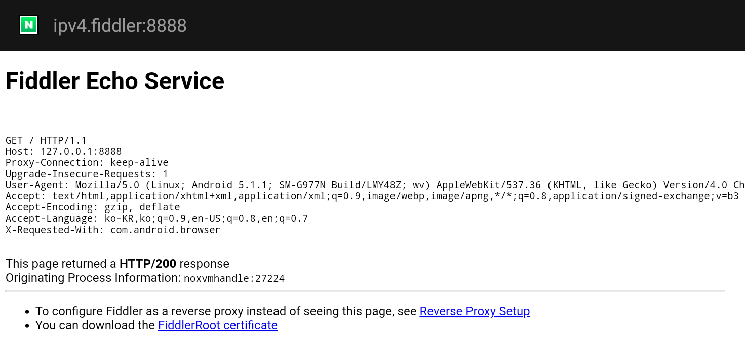 - 모바일 브라우저에서 http://ipv4.fiddler:8888 주소로 접속한다.