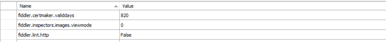 "fiddler.certmaker.validdays"를 820으로 설정(추가)한다. 루트인증서의 유효기간을 설정하는 것이다. 너무 길면 인증서 검증이 안되니 820일로 조정한다.