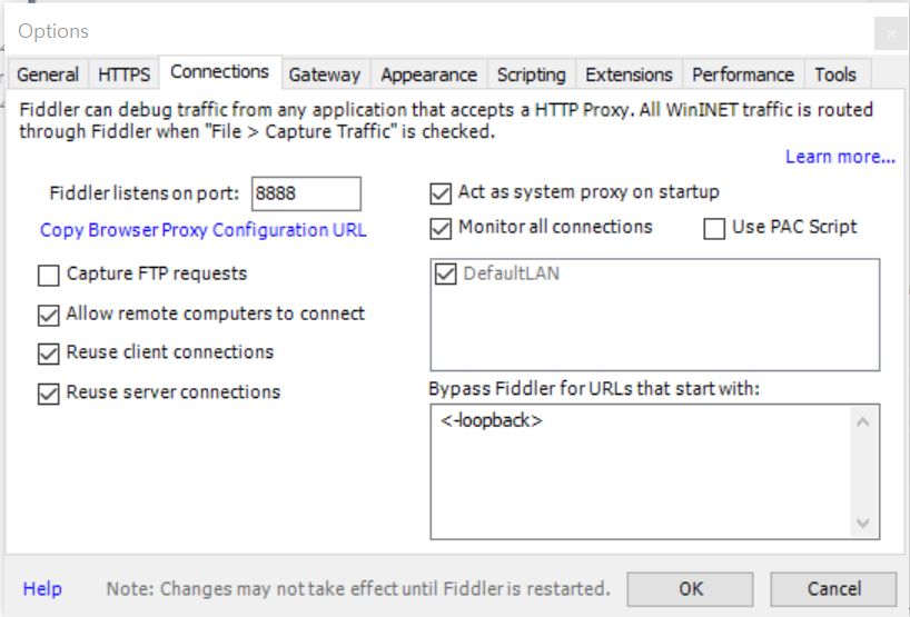 NOTE: You can check your IP address by hovering over the Network Connection icon in the Fiddler toolbar. - Type the Fiddler listening port (8888 by default) in the Proxy port field