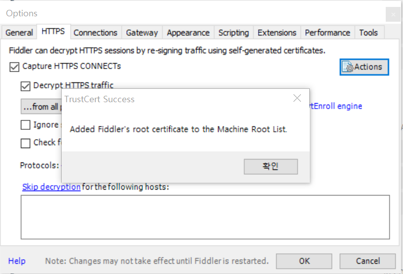 Fiddler를 껐다가 켜서 설정을 적용시킨다.