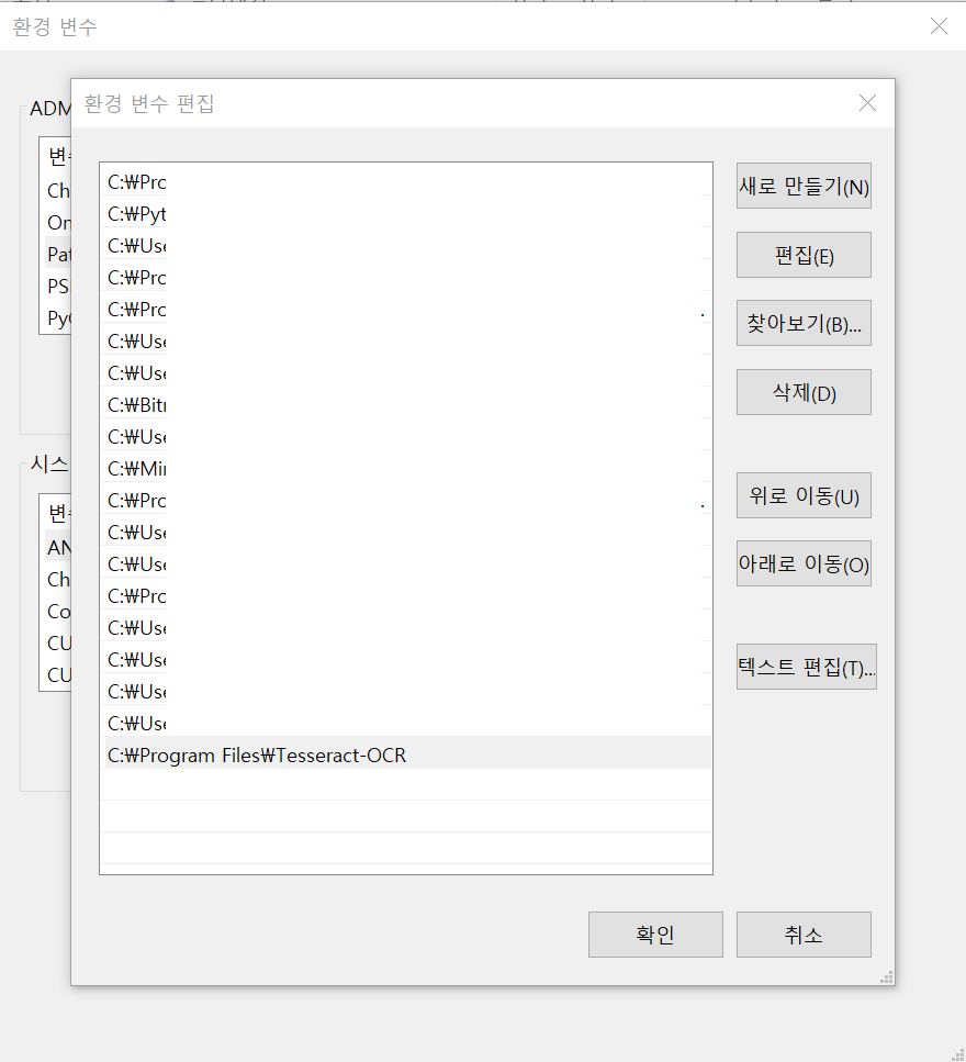 에러가 발생하는 경우 python 코드 상단에 경로 설정 구문을 추가한다. 기본 경로로 설치했을 경우 다음과 같고 경로를 다르게 설치한 경우 테서랙트가 설치된 경로를 입력한다.
