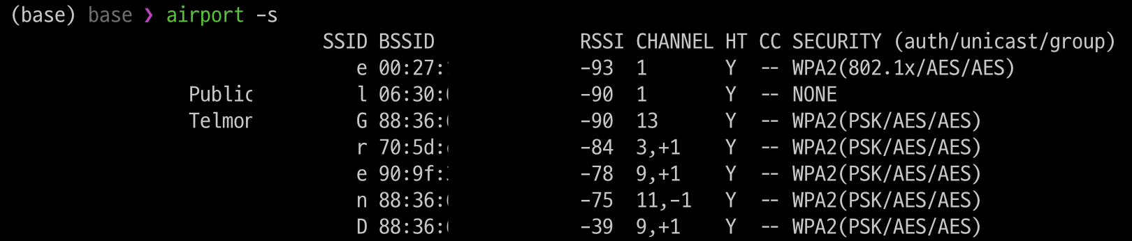 사용 가능한 wifi를 목록으로 보여준다. SSID(Service Set Identifier), BSSID(Basic Service Set Identifier), 신호 세기(RSSI), 채널(Channel), 사용중인 암호화 알고리즘(Security) 등을 보여준다. 실습을 위해 준비한 SSID를 찾아서 기록해 둔다.
