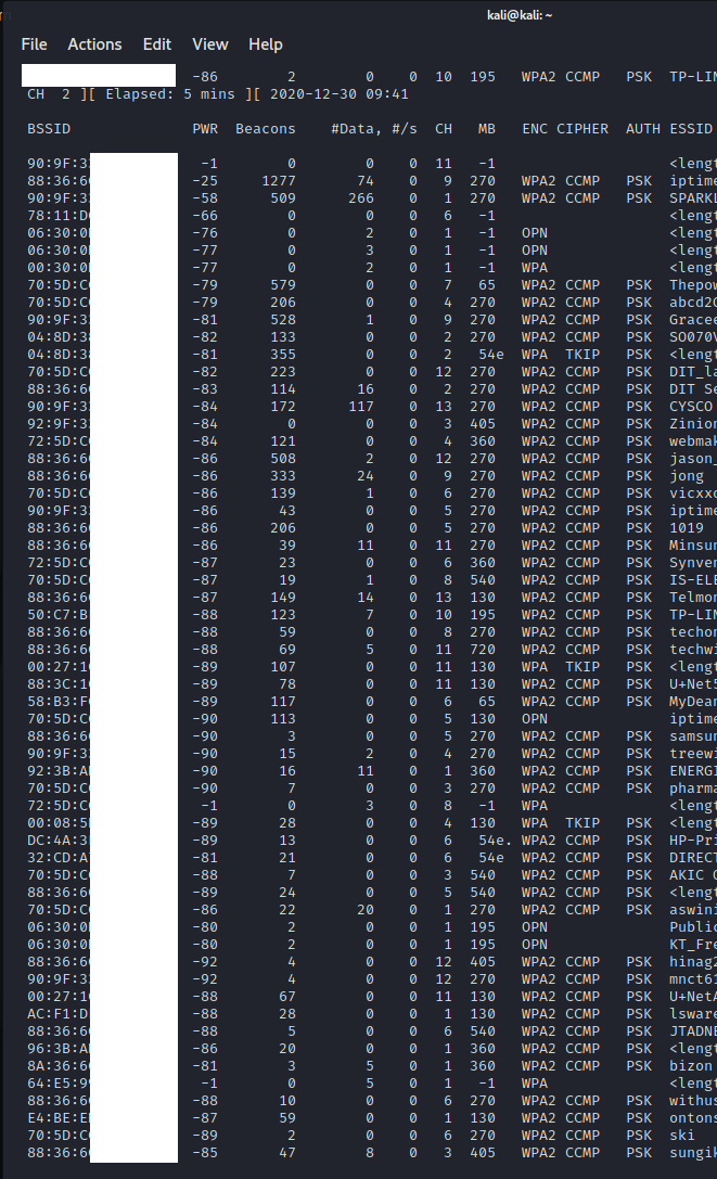 # airodump-ng [interface] //주변의 네트워크 트래픽 캡처