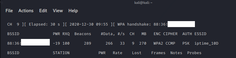 deauth 패킷을 전송해서 재연결을 수행할 때 airdump-ng 셸에 handshake 패킷이 캡쳐됨을 확인할 수 있다.