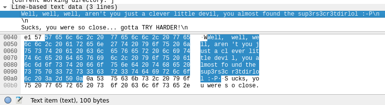 통신 중 Line-based text data에서 힌트로 의심되는 문자열(sup3rs3cr3tdirlol)을 발견한다.
