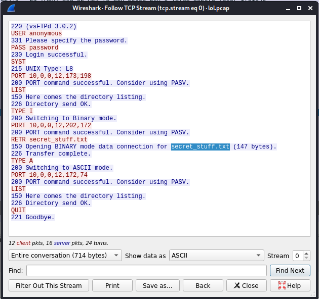 파일을 분석해보면 FTP 통신의 기록이다. secret_stuff.txt 파일을 전송하는 과정이 포함되어 있다.
