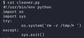 cleaner.py을 열어 내용을 확인한다. ssh 연결을 끊는 구문은 없지만 tmp 파일을 삭제하는 파일임을 확인한다.