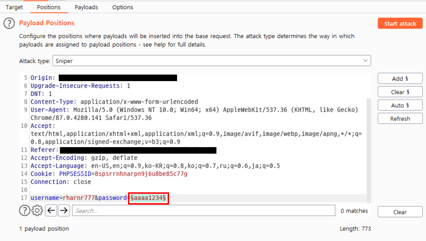 Step3:로그인 시도 횟수 제한이 존재하지 않으므로 무차별 대입 공격을 시도할 수 있습니다. Burp의 Intruder 기능을 이용하여 공격을 시도합니다.