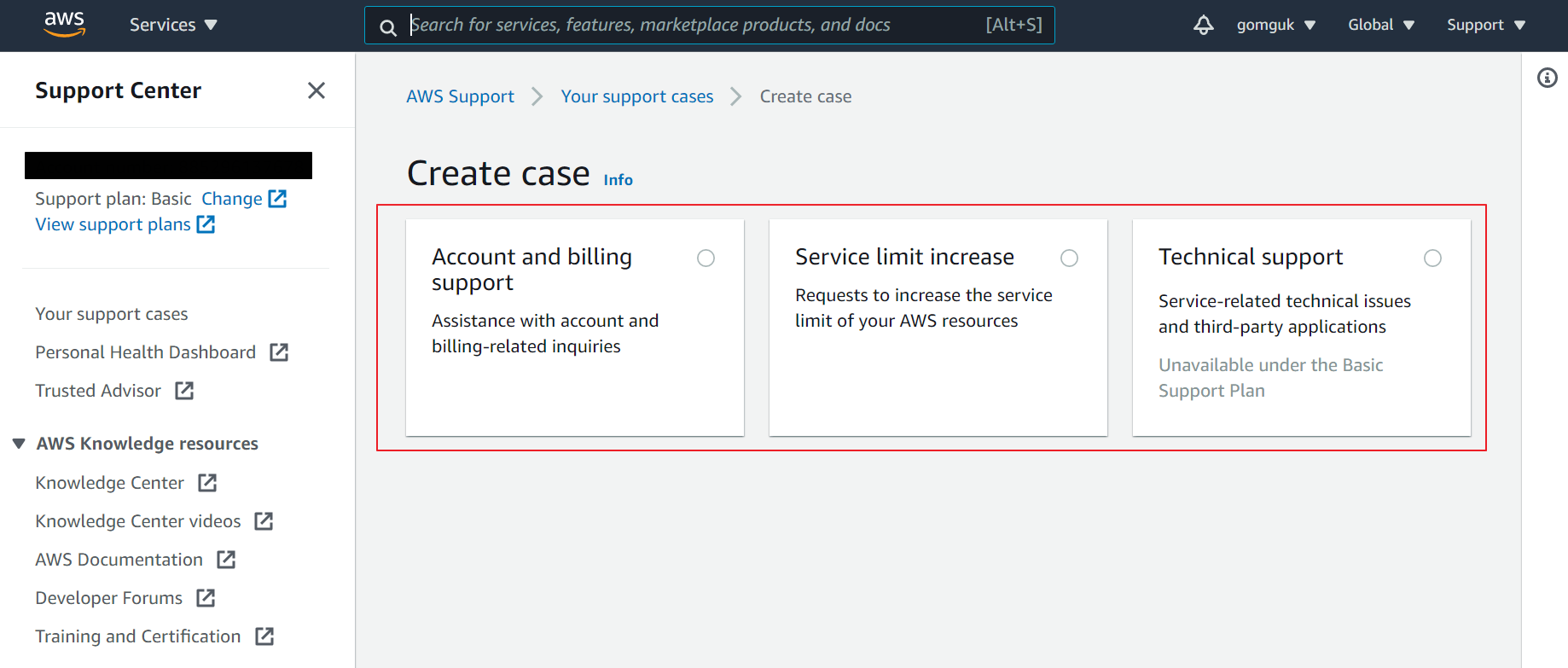 1. AWS 계정으로 로그인한 후에 Support Center에 접근한다.