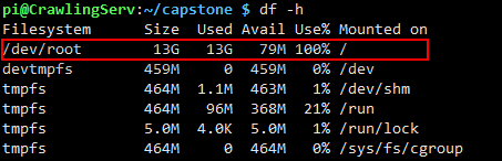 시스템 용량 확인 결과 사용 용량이 100% 인 것을 확인할 수 있었고 OS가 시스템보호를 위해 RO 시스템으로 전환한 것 같았다.