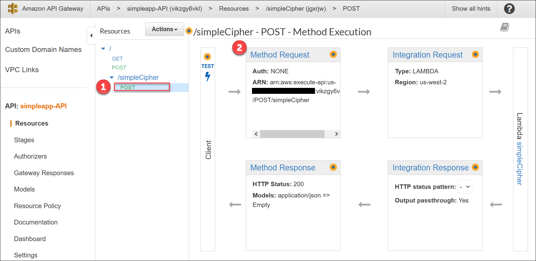 API Gateway에서의 설정은 끝났습니다. 선언한 리소스에 대해 배포(Deploy)한 후 Test를 진행합니다.