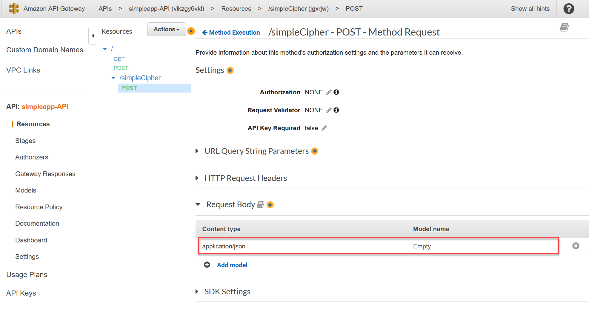 요청으로 받은 body의 값을 어떻게 엔드포인트(lambda)로 전달할지 결정합니다. application/json을 선언합니다.