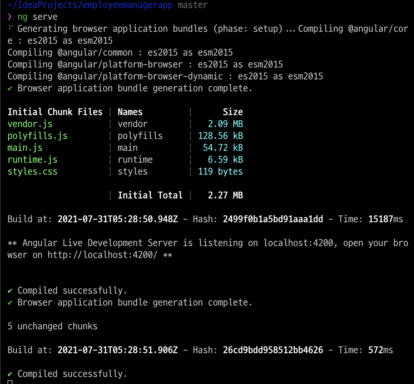 프로젝트를 생성한 경로로 이동한 후 ng serve 명령어를 통해 서버를 시작할 수 있다.