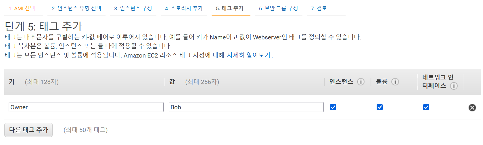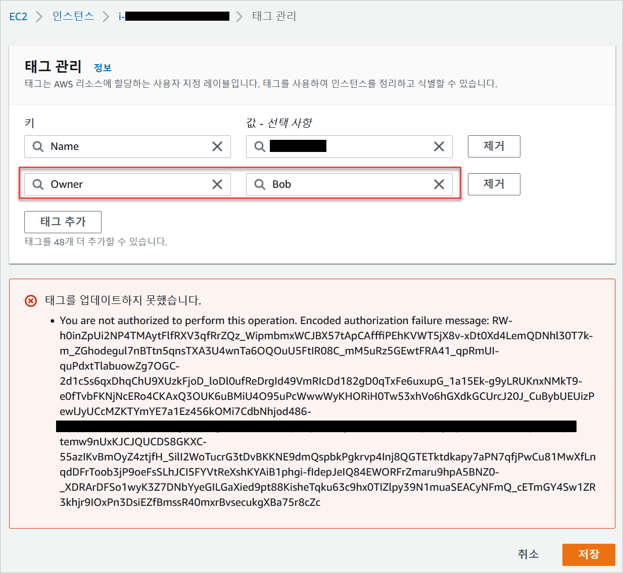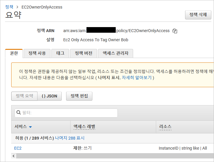- 태그로 제한한다. - 태그이름 Owner가 Bob으로 설정된 인스턴스에만 접근이 가능하도록 한다.