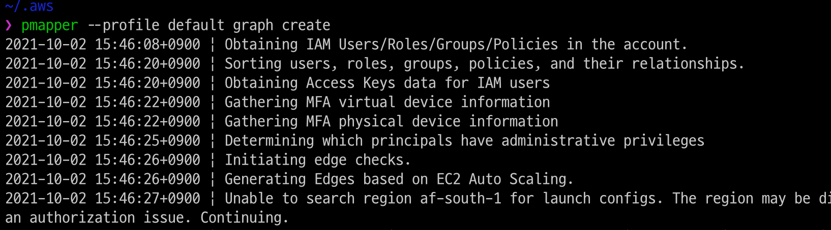 iam:GetAccountAuthorizationDetails 등 작업에 필요한 필수 권한이 허용되어 있지 않다면 pmapper는 에러를 발생한다.