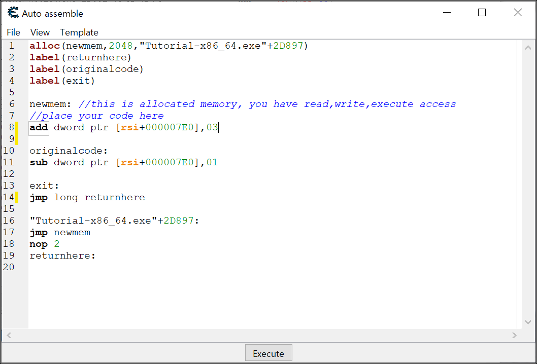 Memory Viewer - Auto Assembler - Template - Code Injection으로 접근한다.
