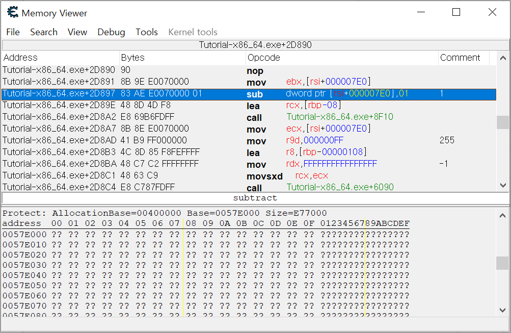 sub 명령어를 통해 0x01씩 값을 뺄셈 연산하고 있는 것을 확인할 수 있다.