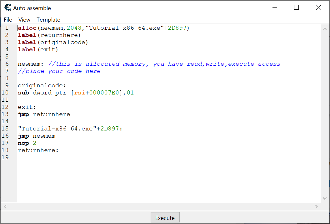 Memory Viewer - Auto Assembler - Template - Code Injection으로 접근한다.
